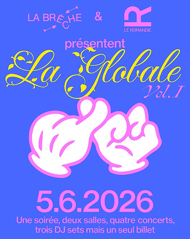 La Brèche s’associe au Romandie pour une soirée commune : La Globale vol. I. Un seul billet donne accès aux deux salles et permet de circuler librement entre les concerts et les espaces. Deux concerts dans chaque lieu, suivis de DJ sets.